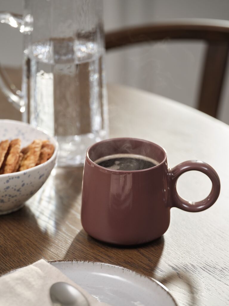 Hrneček z kameniny v nachové barvě s jednoduchým moderním designem. Velký objem je ideální na kávu nebo čaj. Pro snadné čištění je hrneček vhodný do myčky. Ø10xV9 cm
