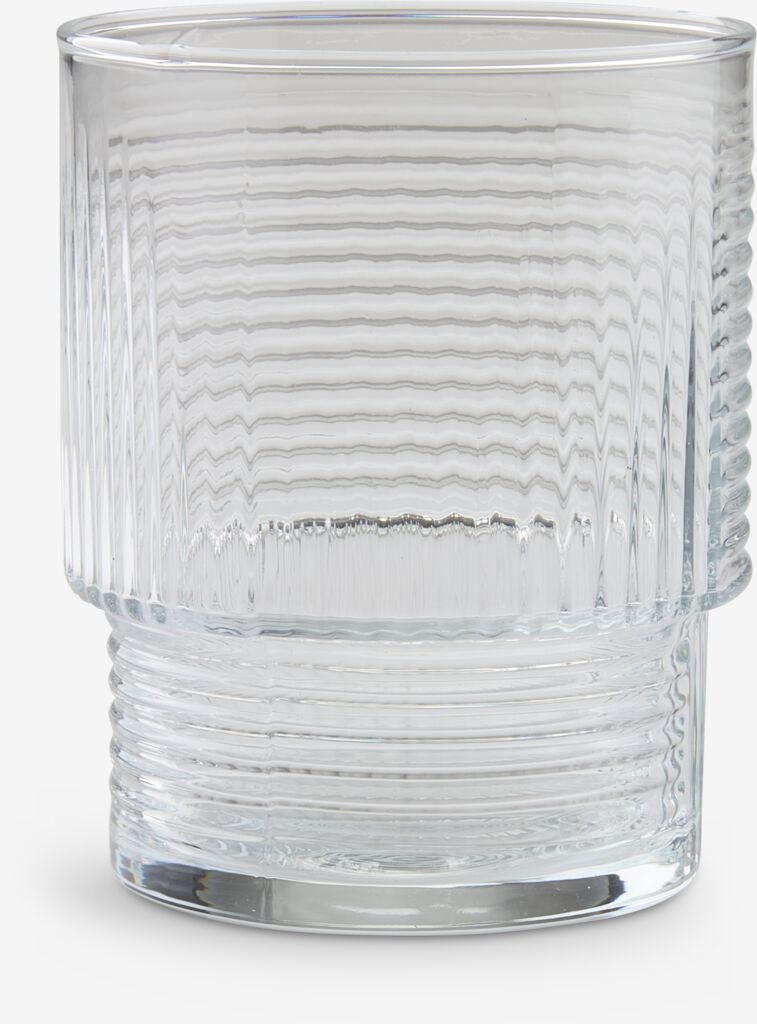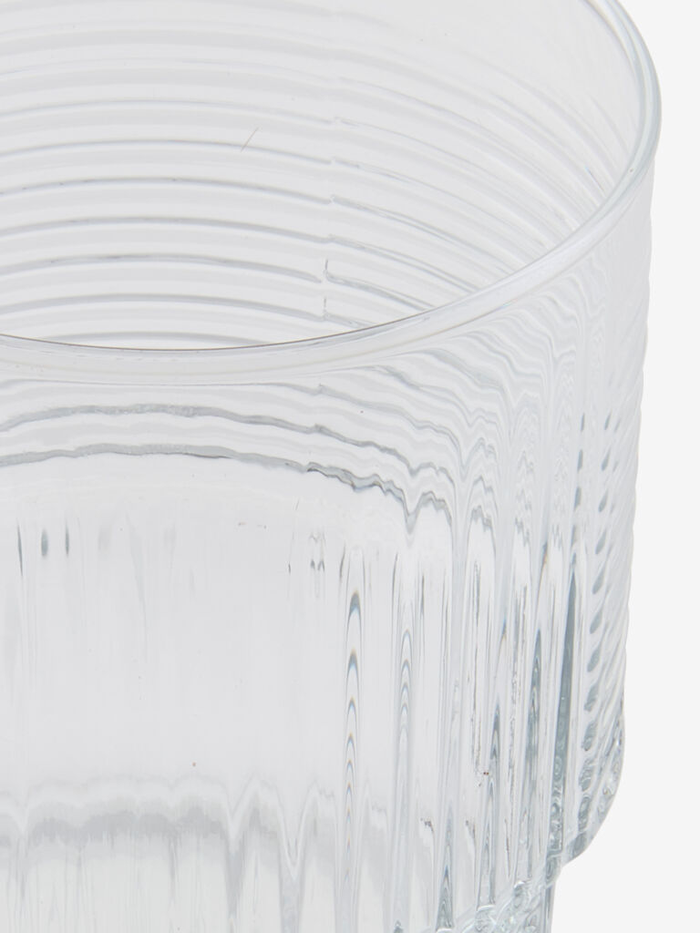 Sklenička z čirého skla s výrazným žebrovaným designem. Tato textura zajišťuje moderní vzhled a pevný úchop. Sklenička má objem 32 cl a je vhodná do myčky. Ø8 x V10 cm