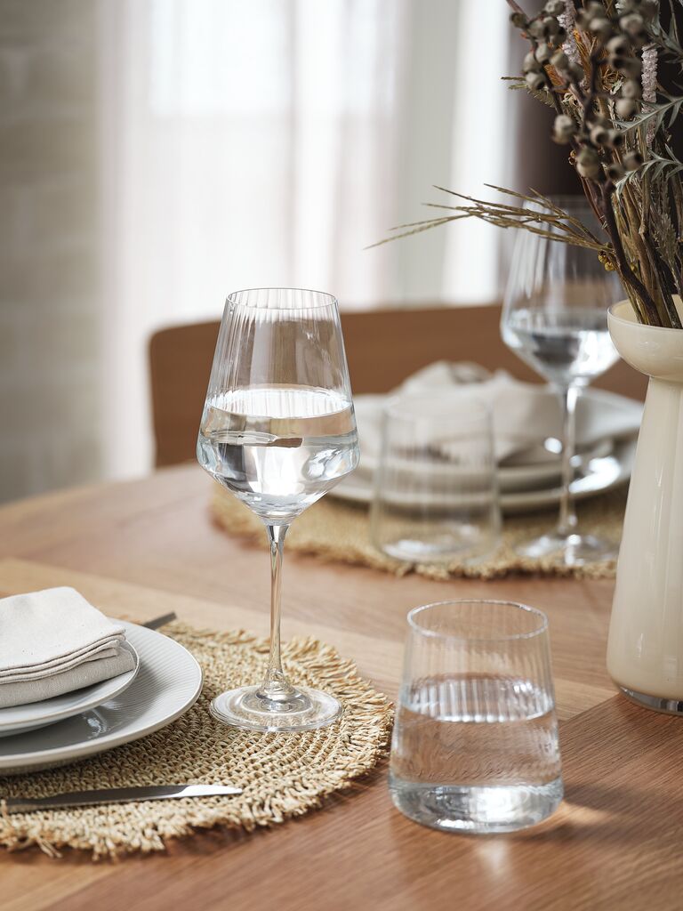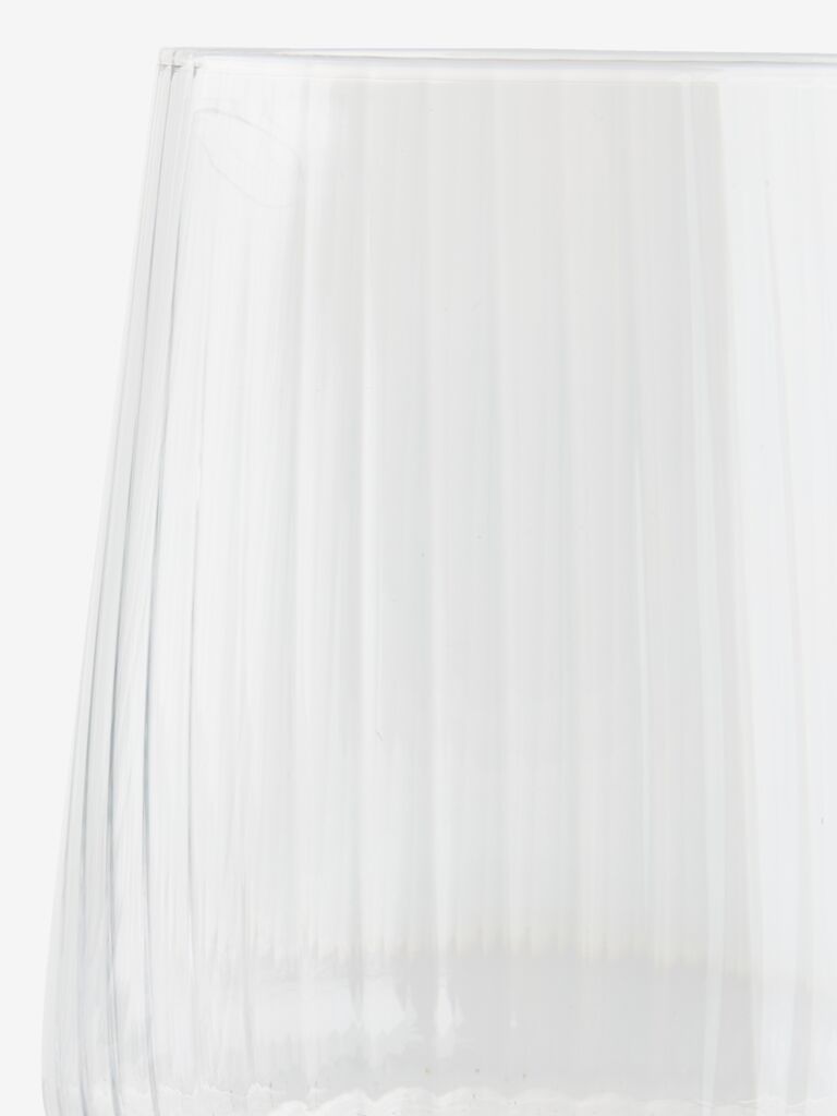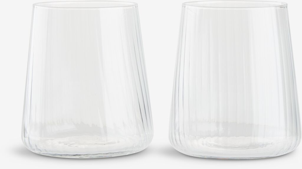 Sklenička z čirého skla s moderním tvarem a jednoduchým žebrovaným designem. S velkorysým objemem 42 cl je vhodná pro každodenní nápoje a je vhodná i do myčky. Balení po 2 ks. Ø9 x V10 cm