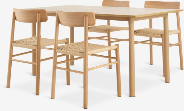 Stůl: Dekorační dýha a ocel. Š90xD160xV75 cm. Židle: Papírová příze, masivní dub a dubová dýha.
