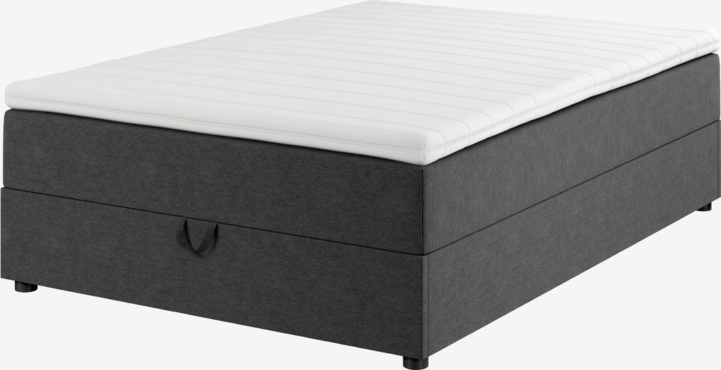 Luxusní boxspring postel. 1 pružinová matrace s taštičkovými pružinami 240/m² rozdělená do 5 zón komfortu s výplní z polyuretanové pěny. Jedna 5 cm vysoká vrchní matrace s jádrem z polyuretanové pěny. Pratelný pružný potah s měkkým hustým prošíváním. Základ tvoří jeden polstrovaný rám. S úložným prostorem. Vč. nohou. Bez čela. 140x200 cm