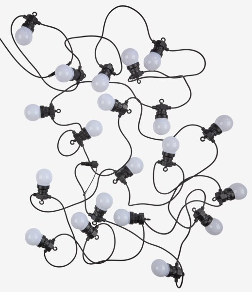 Venkovní světelný řetěz s 20 kulatými LED žárovkami, které na vaší zahradě nebo terase vytvoří příjemnou atmosféru. Lze propojit až 3 světelné řetězy TERNE a řetěz tak prodloužit. D700xØ5 cm
