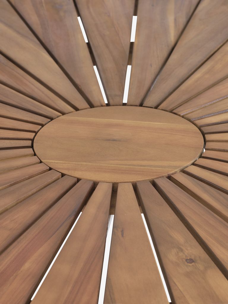 Kulatý zahradní stůl s deskou z olejovaného FSC® tvrdého dřeva. Bílý rám a nohy z práškově lakované oceli. Odolné dřevo je ošetřeno olejem pro ochranu a zdůraznění přirozené barvy. Díky pravidelnému olejování si dřevo zachová barvu a získá ochranu před vlhkostí. Ø120×V74 cm