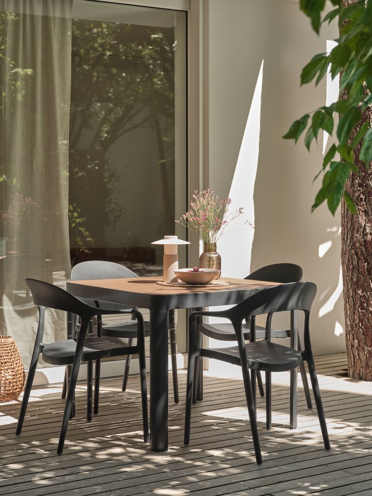Zahradní stůl s deskou z olejovaného FSC® tvrdého dřeva. Tmavě šedý rám a nohy z práškově lakovaného hliníku. Odolné dřevo je ošetřeno olejem pro ochranu a zdůraznění přirozené barvy. Díky pravidelnému olejování si dřevo zachová barvu a získá ochranu před vlhkostí. Hliník je lehký a robustní materiál odolný vůči korozi. Š91xD91xV75 cm