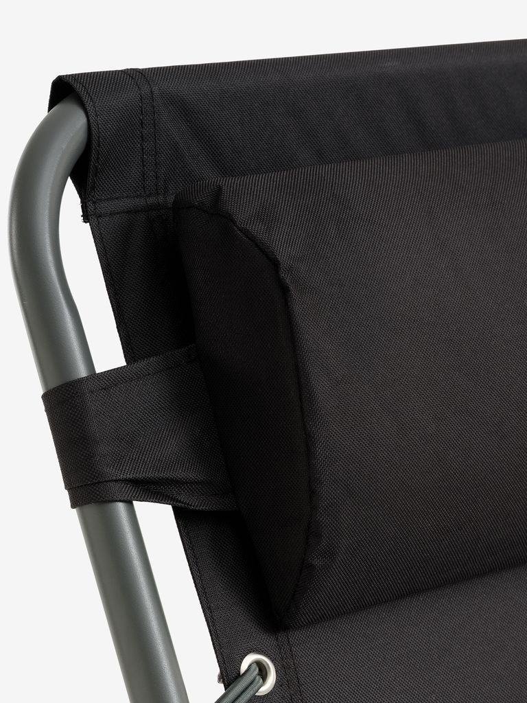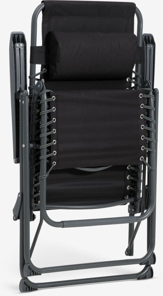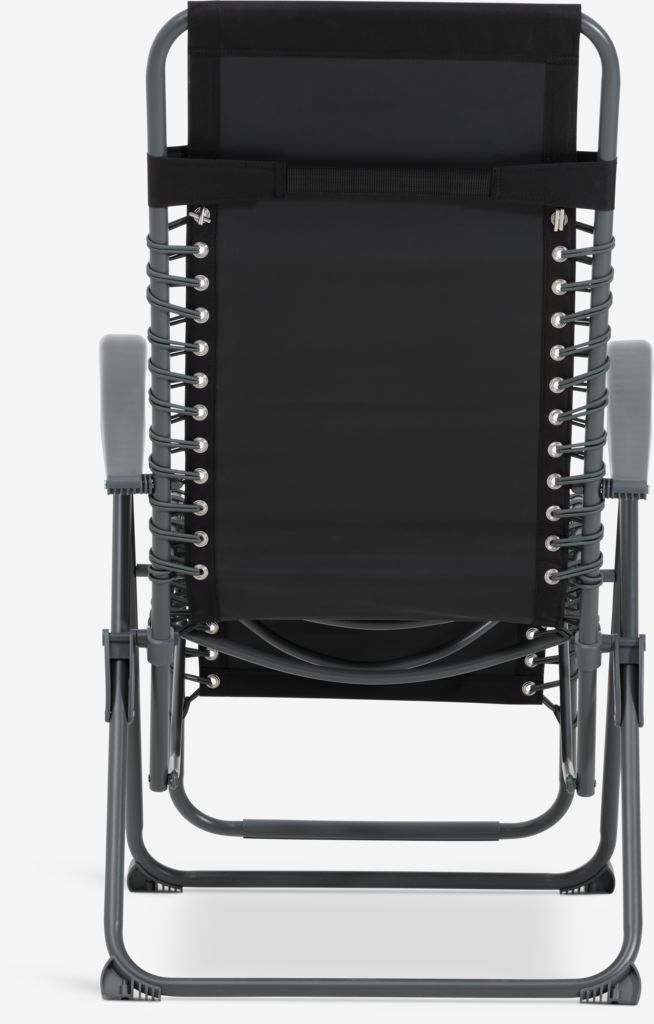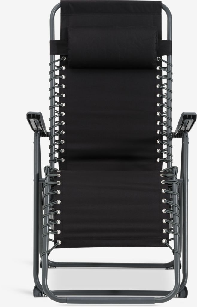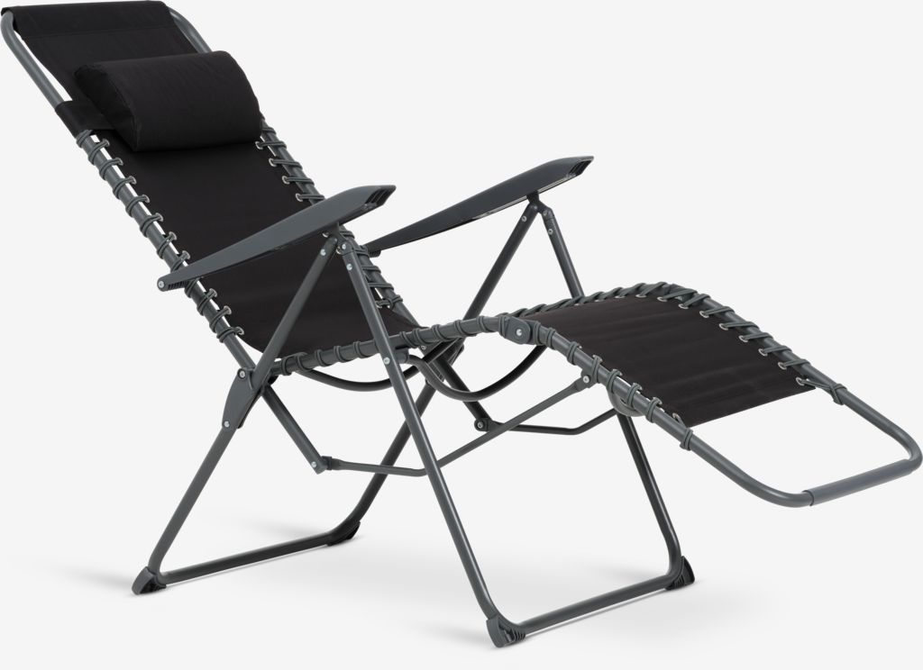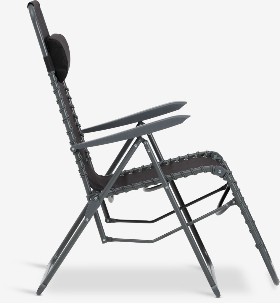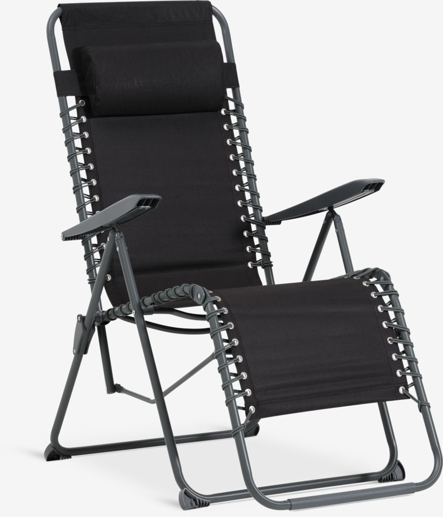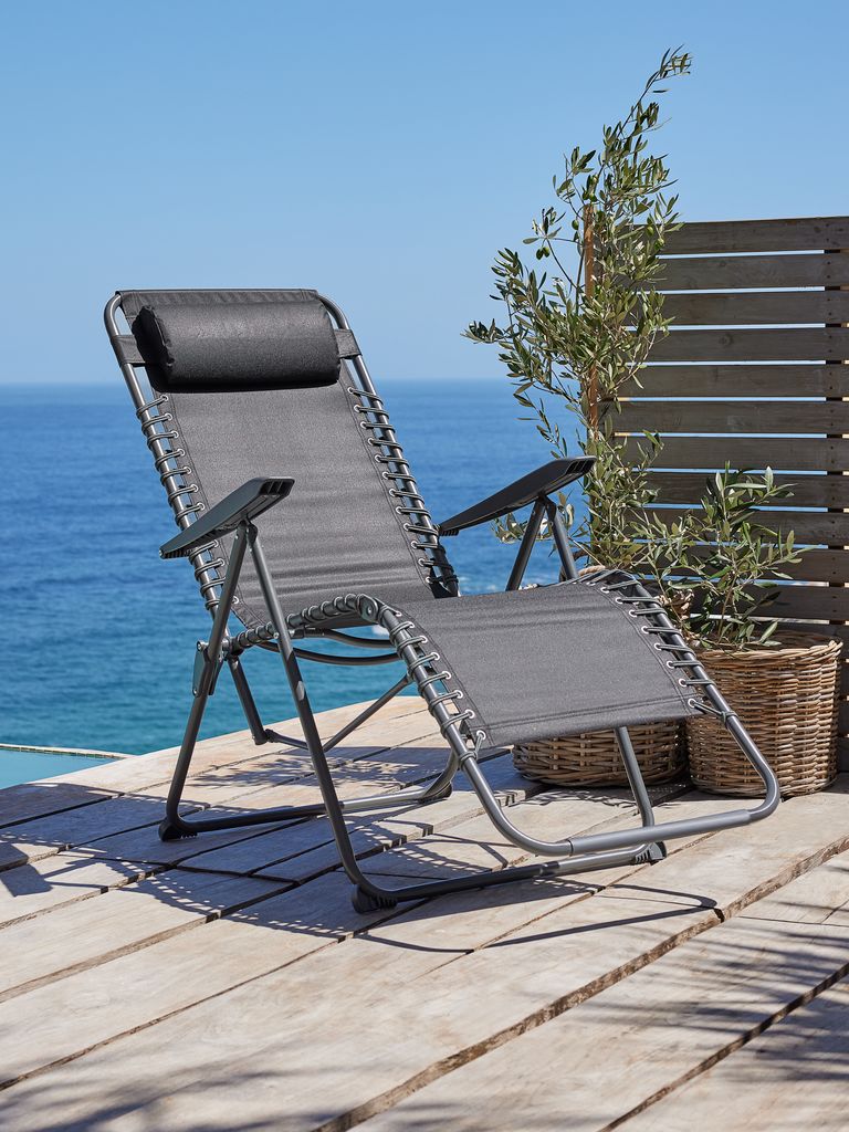 Relaxační křeslo z oceli a polyesteru. Plynulé naklápění opěradla a polohování podnožky. Skládací.