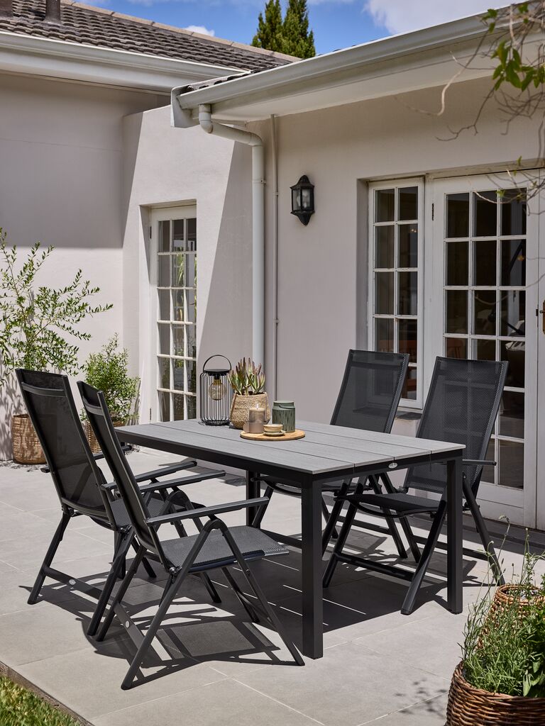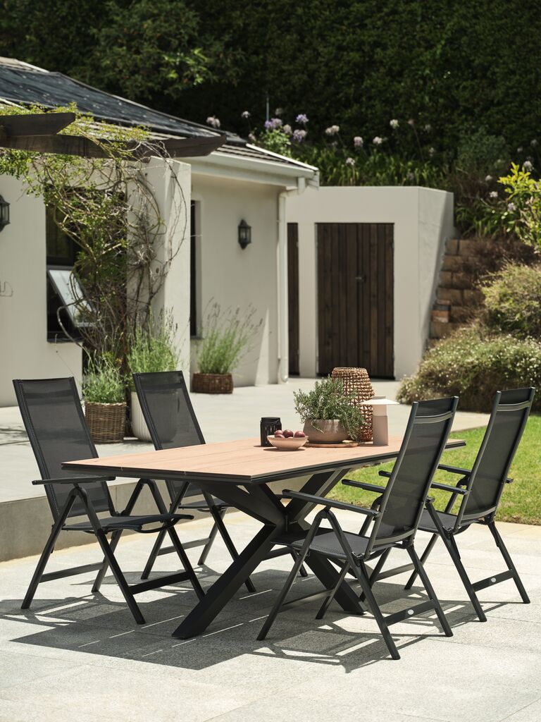 Černé polohovací křeslo se sedadlem a opěradlem z textilenu a rámem z práškově lakovaného hliníku. Opěradlo lze naklopit do 6 poloh. Textilen je pohodlný a stálebarevný materiál, který rychle schne a snadno se čistí. Hliník je lehký a robustní materiál odolný vůči korozi. Zahradní křeslo lze naplocho složit, což usnadňuje přenášení a skladování.
